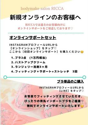 RICCAをご利用頂いているお客様は、バストの状態を確認させていただきたいため公式LINEの方にお写真をいただくか、ご来店またはオンラインサポートをご利用ください。